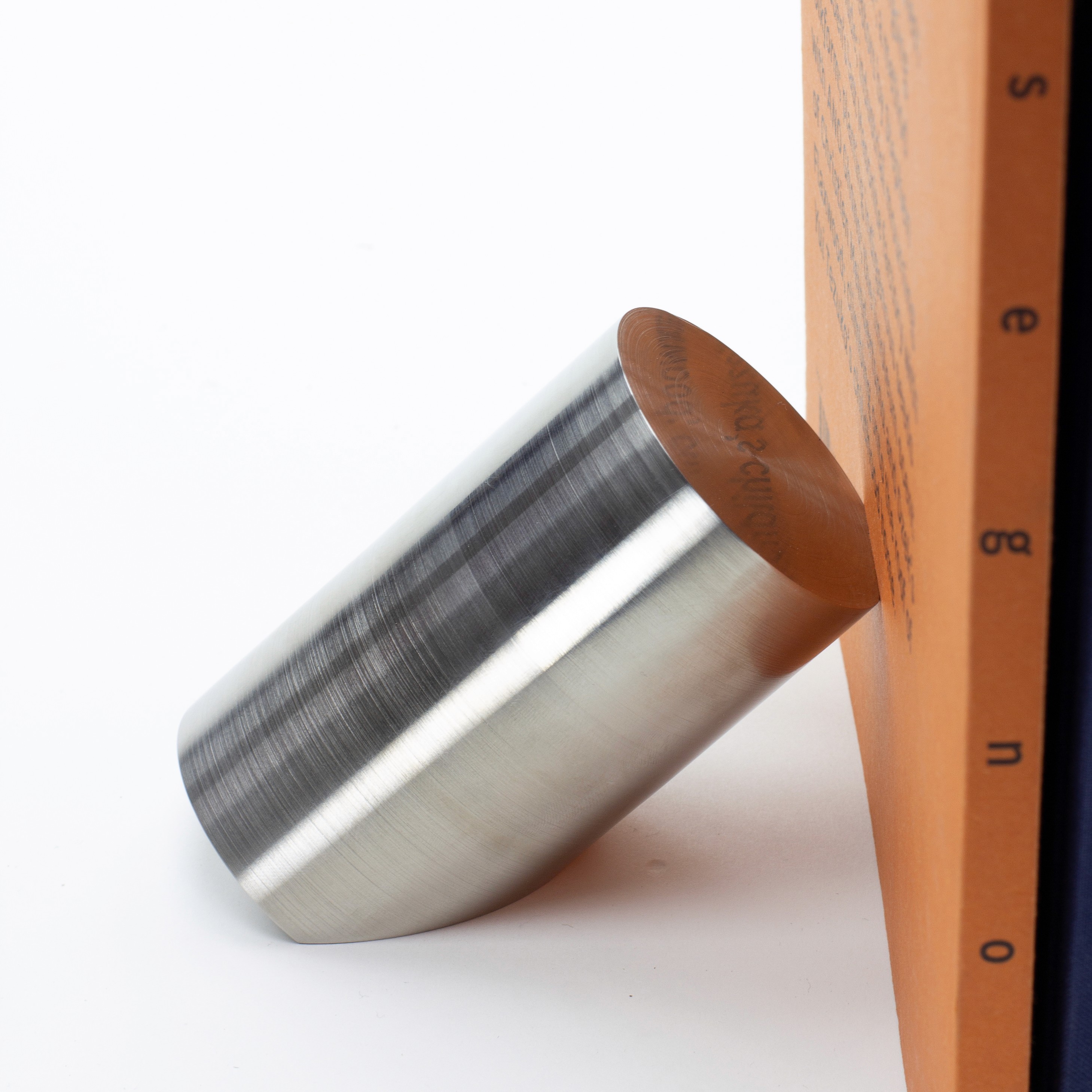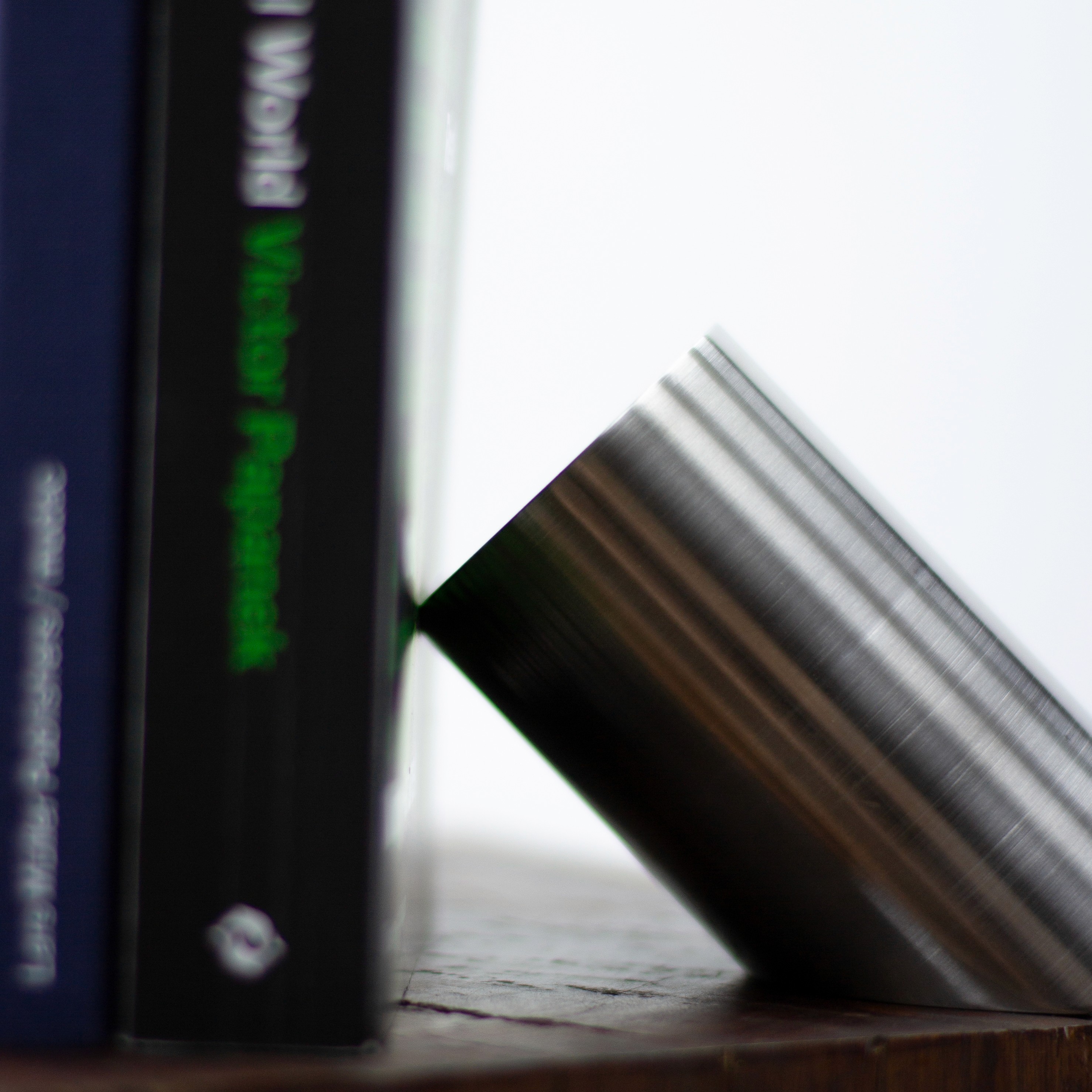 A STAINLESS STEEL BOOKEND, PRECISELY MACHINED AND ENGINEERED TO REST SECURELY AT A 45-DEGREE ANGLE, CREATING A STRIKING VISUAL EFFECT. EXTENSIVE ITERATIONS WERE CARRIED OUT TO OPTIMIZE ITS CENTER OF GRAVITY, ENSURING BOTH STABILITY AND USER SAFETY.
